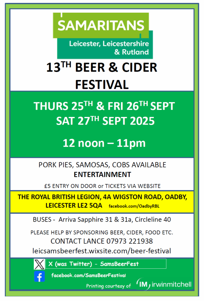 Samaritans Beer Festival – Starts Thursday 25th September at Oadby Royal British Legion.